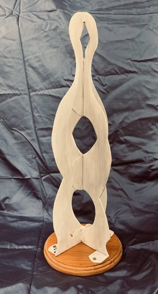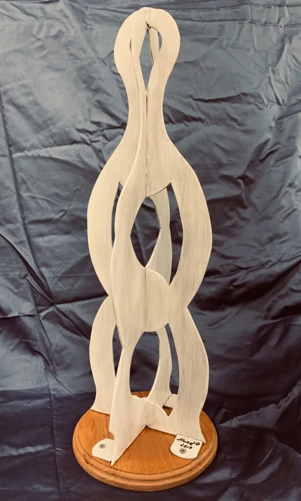 Changing Perspectives is an abstract welded piece in aluminum. It is 2 feet tall and is intended to be a maquette for a much larger version of the same piece. The finished piece will be 8 to 10 feet tall in either aluminum or steel. This piece represents familiar conversations between two people who are not accepting each other’s opinions. This is becoming more and more common recently and our government leaders show us some of the worst examples. To get to a more meaningful and productive discussion each person has to take a step back and try to understand the other person’s perspective. This is the first step in being able to have a conversation where we may disagree but we can do so with dignity and respect while also gaining some value from an opinion with which we may not be in agreement.