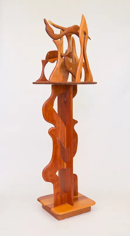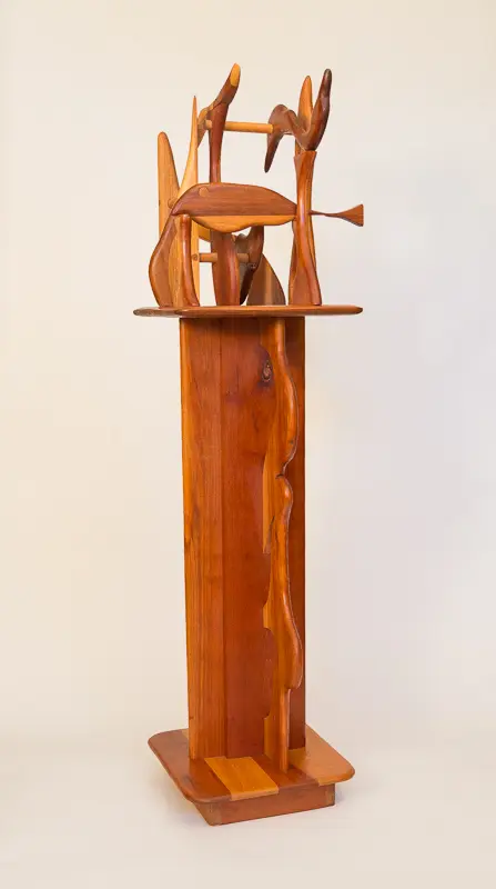 This mostly abstract piece was made in using several species of wood including cherry and black walnut. As with most of my wood pieces, I did not leave any obvious clues about how the pieces were joined together. This piece is about 4 ½ feet tall. There are obvious references to birds and fish.