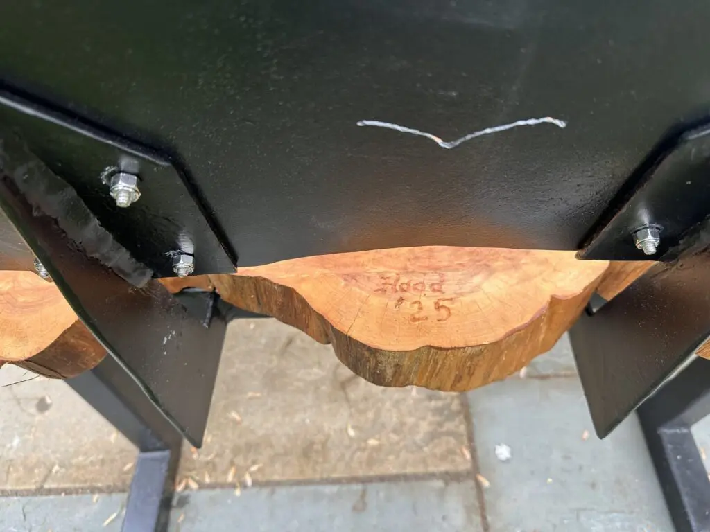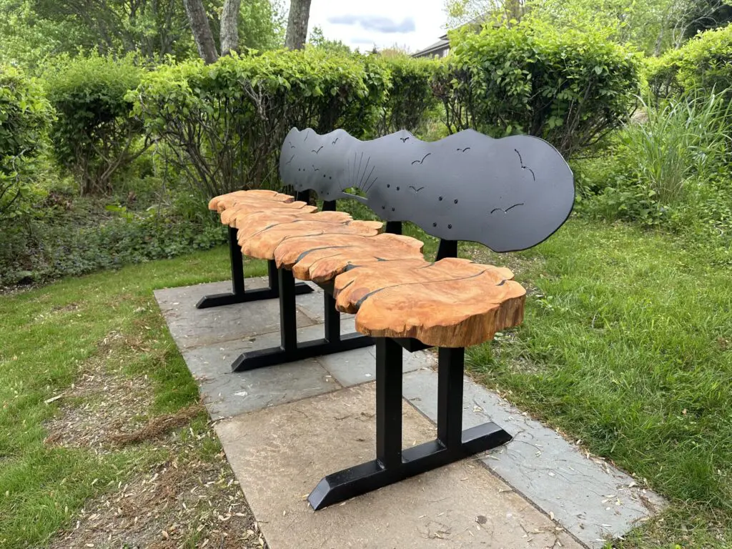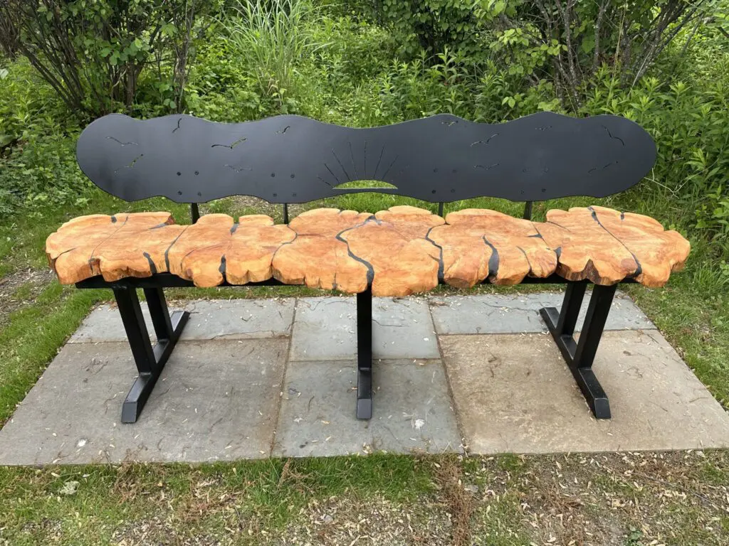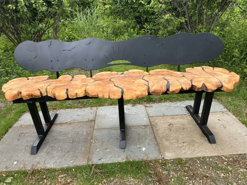 This is a piece I created in 2025.  I had been asked by my wife to make an outdoor bench for a special location in our yard.  Our neighbors had a number of eastern red cedar slabs that I could use for the seat.  I used a chainsaw and grinders to mold and shape the slabs into a 7′ bench.  All voids were filled with black epoxy.  The frame and back are welded still, painted with automotive paint to minimize corrosion.  There are roughly 100 hours of labor in this piece.  It is not for sale.