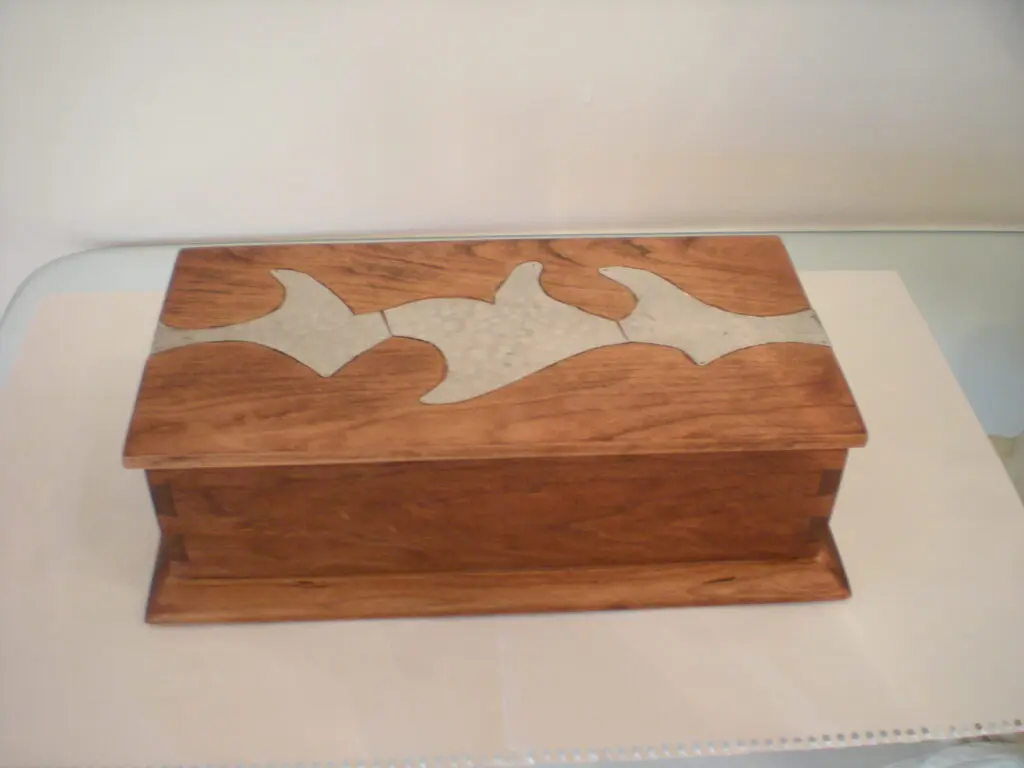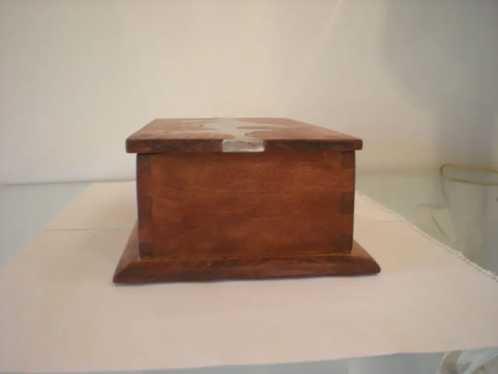 The box is made from cherry and has a pewter foil inlay. The inside is lined in green felt.